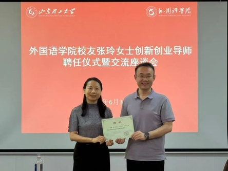 为充分发挥优秀校友的示范引领作用,助力我院学生树立正确就业观、创业观,提升职业规划能力,6月3日,我院在8号教学楼和三号报告厅举办校友张玲女士创新创业导师聘任仪式暨校友大讲堂活动,深圳市掌领科技有限公司总经理张玲,山东亘泽医疗科技有限公司总经理、我院校友会秘书长徐东,乐维实业有限公司(香港)总经理郭奎,淄博英真国际贸易有限公司总经理练磊等优秀校友受邀出席,学院党委副书记、纪委书记宋伟,副院长张燕,综合办公室主任鹿宏,辅导员代表及学生代表参加活动。