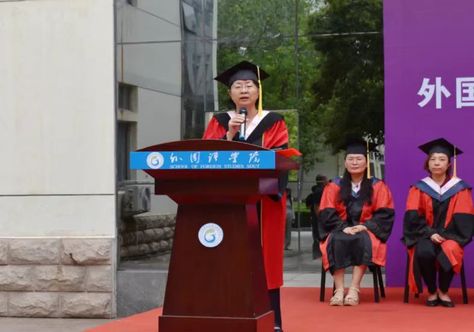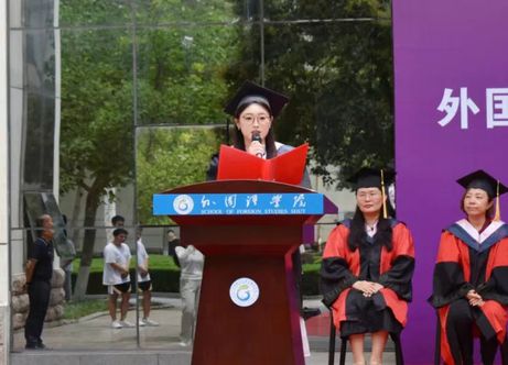 本科毕业生代表高宇涵代表全体毕业生发言。她代表全体毕业生向父母的养育、老师的栽培及同学的陪伴致以最诚挚的谢意,特别提到学院在学科建设、国际化交流等方面的发展为学生成长提供的肥沃土壤。她表示,从初入校园的懵懂到自信跨文化沟通的蜕变,每一步都凝聚着老师们的心血。未来将牢记“厚德、博学、笃行、至善”的校训,以“外院人”的担当奔赴星辰大海。
