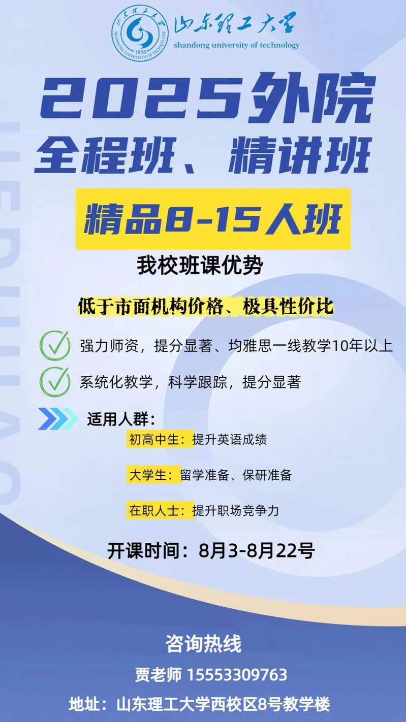 下期班课即将开启!我们将继续秉承专业、负责的教学态度,为大家提供更优质的雅思培训服务。无论你是准备出国留学,还是为了提升自己的英语水平,山理工外院雅思班都是你的不二之选。在这里,你将与志同道合的同学们一起努力,共同追逐高分梦想!